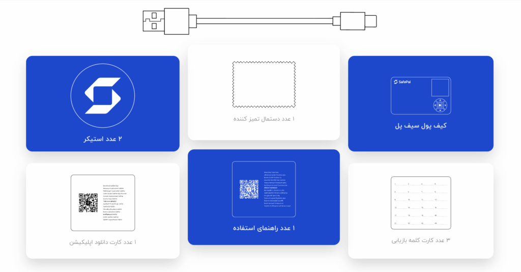 ۲ عدد استیکر و دستمال تمیزکننده ,۳ عدد کارت عبارت بازیاب ,دستگاه SafePal X1 ,کابل USB-A به USB-C. |